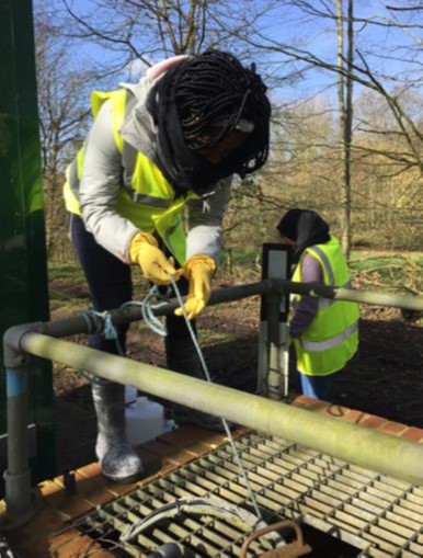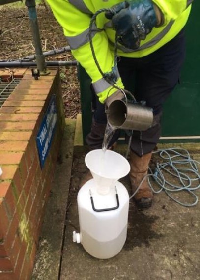 | Students of the University of Bath sampling wastewater effluent: Treated wastewater contains still a wide range of compounds that may affect river and lake ecosystems. | ||